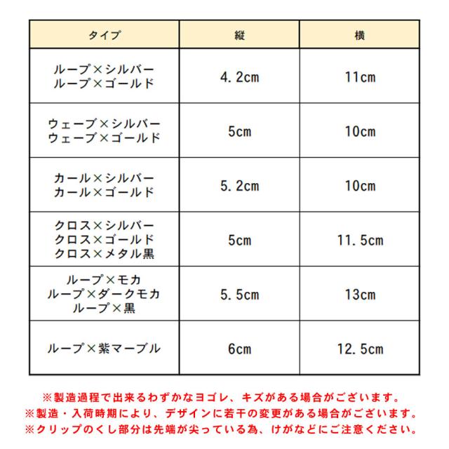 ※製造過程で出来るわずかなヨゴレ、キズがある場合がございます。 ※製造・入荷時期により、デザインに若干の変更がある場合がございます。 ※クリップのくし部分は先端が尖っている為、けがなどにご注意ください。 ※撮影時の環境、ご覧のモニター等の環境により色味が異なって見える場合がございます。ご了承ください。