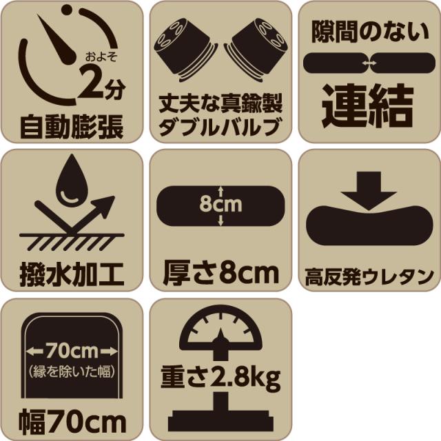 【仕様】 厚さ 8cm 幅広 ワイド 70cm 高反発ウレタン 真鍮バルブ採用 自動膨張 撥水加工 水を弾く コンパクト 軽量 持ち運びしやすい 収納袋付き エアー エア インフレーター インフレータブル 折り畳み 折りたたみ 式 連結