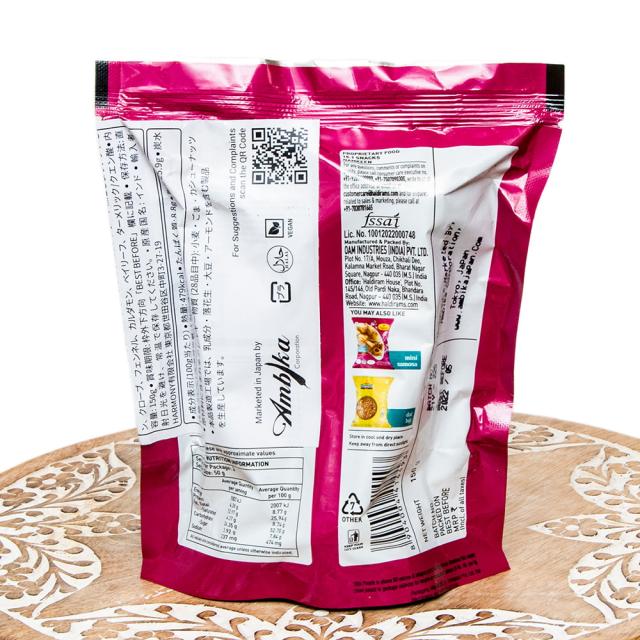 | 原材料・成分 | 小麦粉、パームオレイン、ひよこ豆、砂糖、カシューナッツ、食塩、植物油脂(ごまを含む)、レッドチリ、マンゴー、クミンパウダー、しょうが、グリーンチリ、コリアンダー、黒こしょう、シナモン、クローブ、フェンネル、カルダモン、ベイリーフ、ターメリック/クエン酸 |