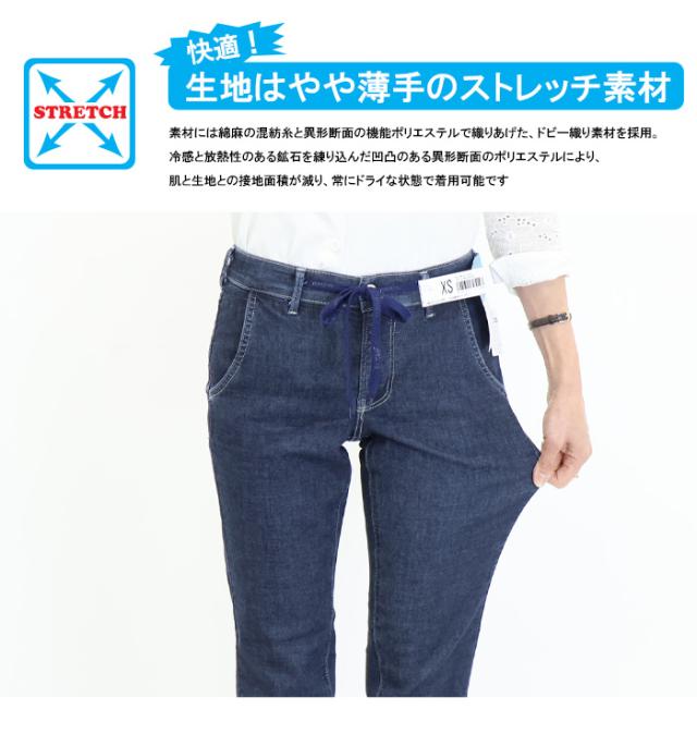 ウエストには調節用のドローコードを採用。腰回りからヒザにかけては脚のラインにフィット。ヒザから下は直線的なラインのスリムストレート。ヒザ下を細く見せ、ふくらはぎの丸みをカバーしてくれる1本です。涼しくストレッチの効いた素材なので おうちの中でも外でも着用可能な万能アイテムです。