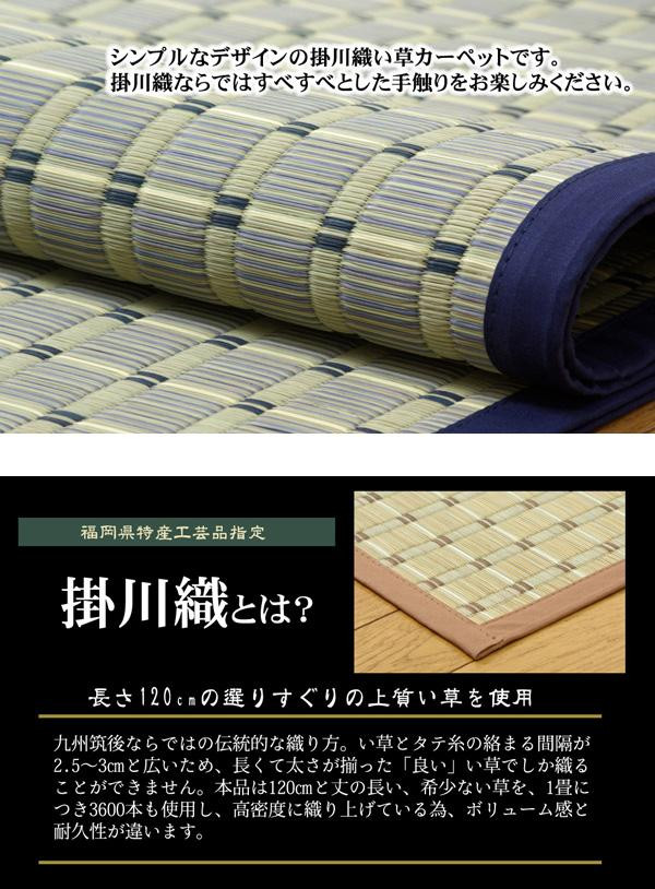 | 掛川織は九州筑後地方の伝統的な織り方です。大きな目と小さな目に交互に織り込んだ美しく洗練されたモダンなデザインが人気です。また、厳選された良質の太く長いイ草を高密度に織り込んでいますので丈夫で耐久性があり、しかも素足に心地よいクッション性とボリューム感があります。い草には空気の自然浄化作用、湿度の調節作用などがあります。また汚れにくく、使用するうちに黄金色に変化し味が出ます。 |