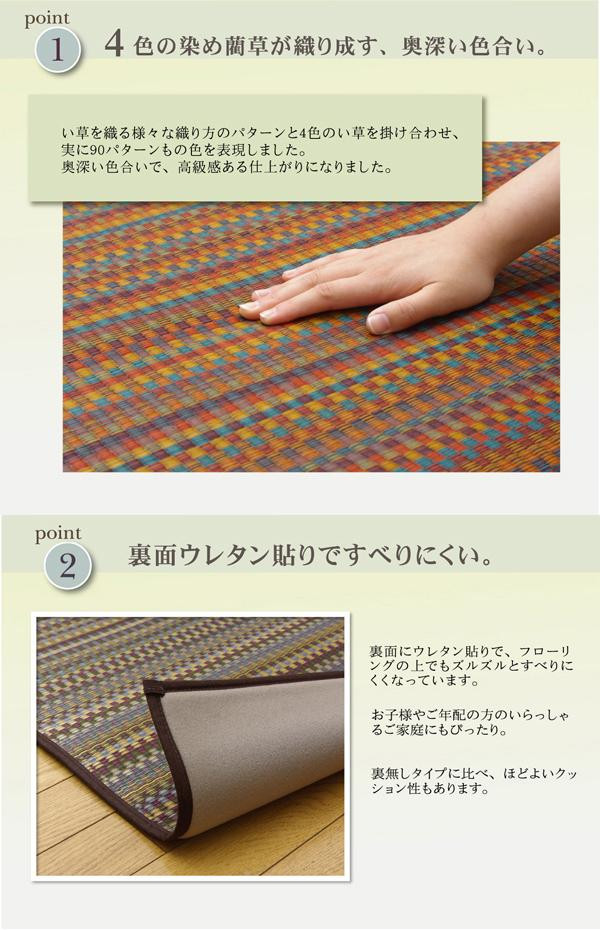 多色を使いながらも落ち着いた雰囲気にに仕上げたイ草カーペットです。国産(九州産)のい草を使用しています。一本一本が太く、表皮が厚く繊維がキメ細かいので弾力性があり、耐久性に優れています。い草には空気の自然浄化作用、湿度の調節作用などがあります。また汚れにくく、使用するうちに黄金色に変化し味が出ます。 |