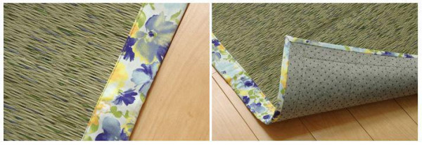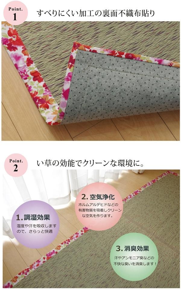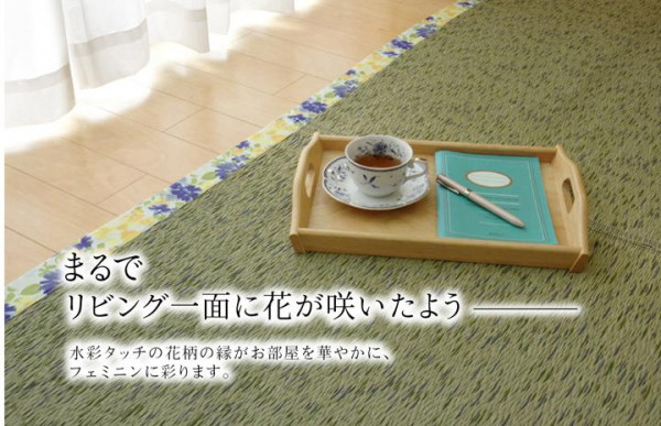 花柄のヘリを用いたい草ラグです。女性らしさ、春らしさを表現した商品です。裏面には滑りにくい加工をした不織布を使用しているため、フローリングにも最適です。い草には空気の自然浄化作用、湿度の調節作用などがあります。 |