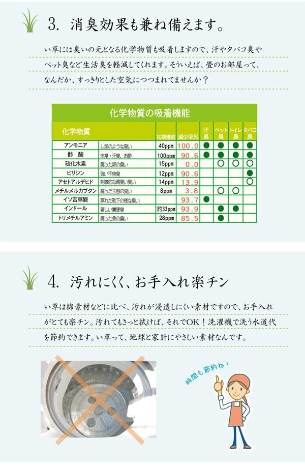 | 素材・材質 | 表地:い草 裏地:ポリエステル100%(不織布) ヘリ:綿100% |