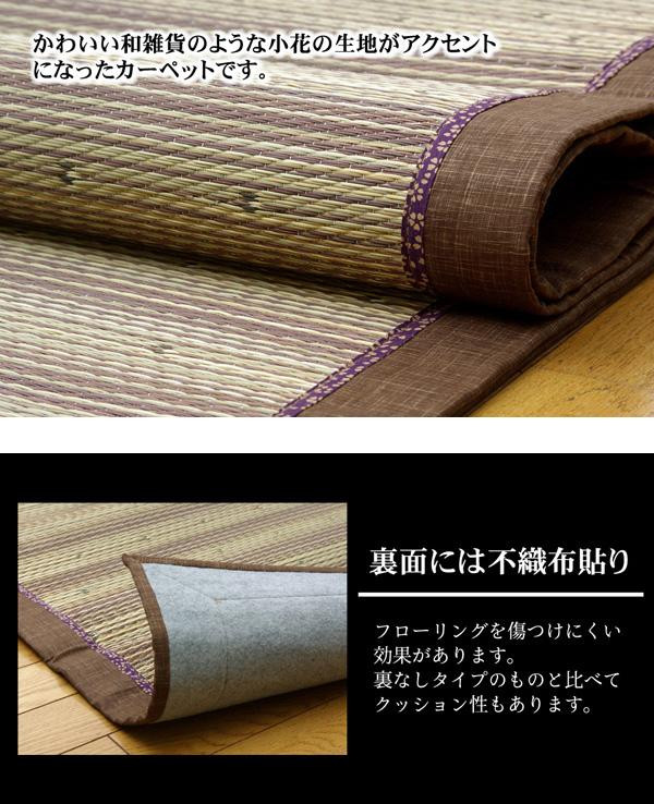 味のある深い色合いの無地縁と小花の縁を二重にする事で、まるで着物のような風合いを表現したい草ラグです。い草には空気の自然浄化作用、湿度の調節作用などがあります。また汚れにくく、使用するうちに黄金色に変化し、味が出ます。フローリングを傷つけにくいよう、裏には不織布を貼っています。 |