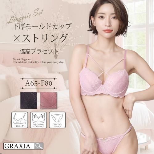 【グラシア】 ブラジャー ショーツ セット ブラセット ランジェリー 下着 カップ クロス ストリング パッド ふんわり モールドカップ モールドカップ 脇高 ふんわりパッド 自然 色気 繊細 レース 谷間 グレー ピンク