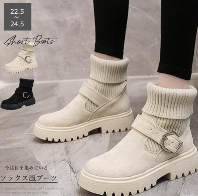 ソックス風 ショートブーツ レディース 2wayニットブーツ バックルベルト 厚底ブーツ 歩きやすい ハイカット ブーツ おしゃれ