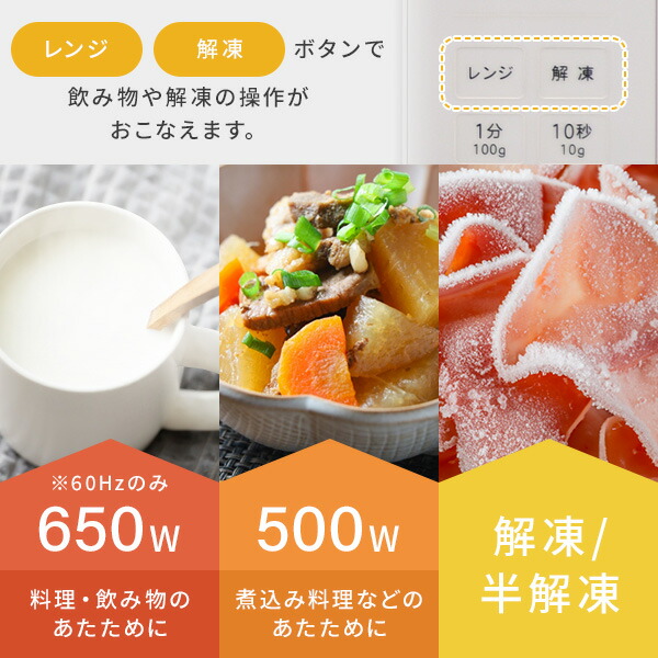 | 商品説明 | ●電源:AC100V(50/60Hz) ●消費電力(50/60Hz):950W/1300W ●発振周波数:2450MHz ●高周波出力(50/60Hz):500W/650W ●出力切替:(50Hz)500W/200W、(60Hz)650W/500W/200W ●オートメニュー:4種類 ●庫内有効寸法:幅27.3×奥行32.5×高さ18.1cm ●電源コード長さ:約1.5m ●電子レンジ機能の年間消費電力量:59.5kWh/年 ●年間待機時消費電力量:0.0kWh/年 ●年間消費電力量:59.5kWh/年 ●オートオフ機能搭載 ●消音機能搭載 ●チャイルドロック搭載 ●メーカー保証:1年間 ※2022年10月よりホワイト色を追加しております |