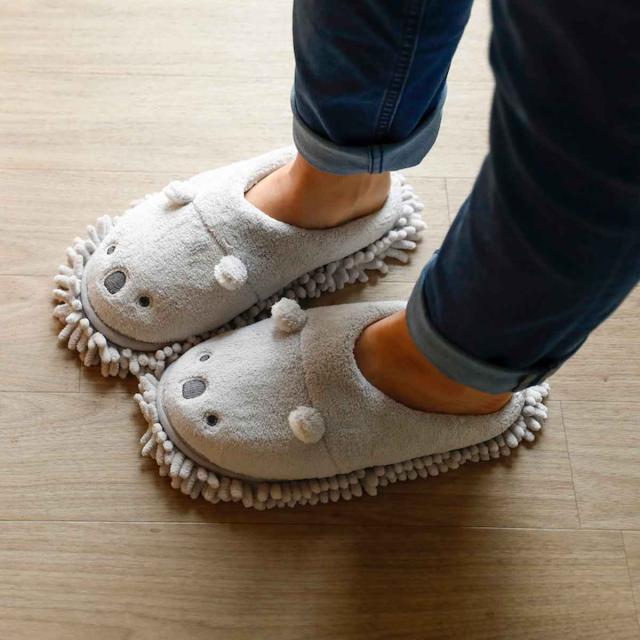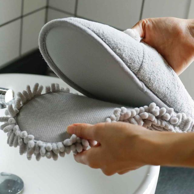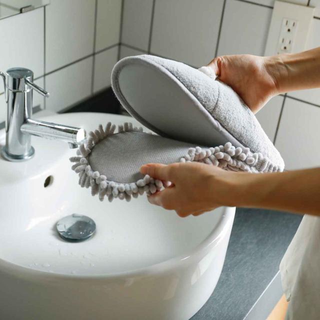 スリッパの裏面にもじゃもじゃのマイクロファイバーモップが付いています。履くだけで簡単に床掃除ができちゃう一石二鳥のアイテム。床の上のホコリも水分もしっかりキャッチできます。