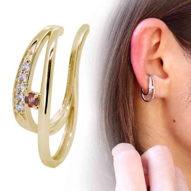18金 イヤーカフ レディース 片耳用 右耳 左耳 イヤカフ 2連 ダブルライン ガーネット