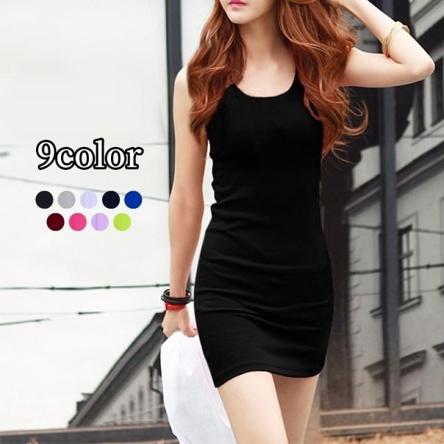 ワンピース ミニ丈 タイト タンクトップ Uネック チュニック丈 ノースリーブ トップス レディース 女性 婦人服 無地 単色