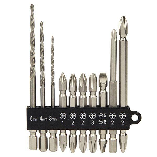 - セット内容:ビット(+1X65mm・+2X65mm(2本)・+3X65mm・+2X110mm・-5-6X65mm・+2X100mm(段付))・下穴用ドリル(3・4・5mm)