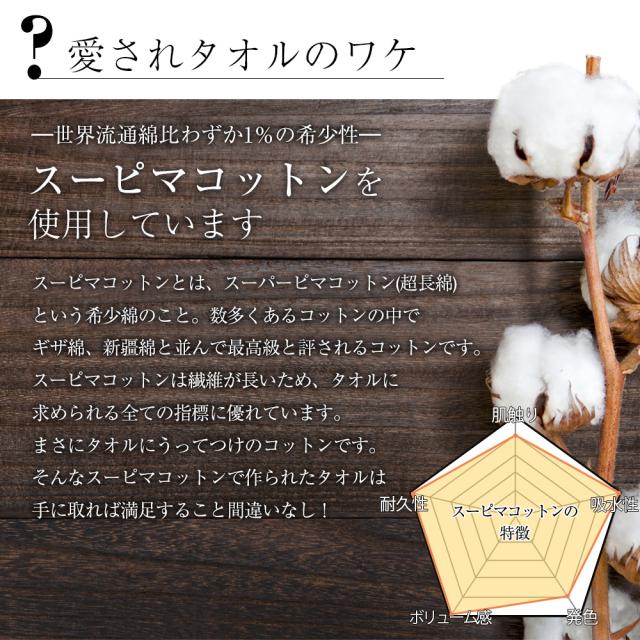 現在スーピマコットンホテルタイプシリーズは16色。そのうちの9色を数量限定で特別価格にてご提供!使った瞬間に感じる上質感。ご家庭で高級ホテルにいるような上質で贅沢な心地よさを味わって頂く為に。抜群な吸水性と、ふっくらやわら感がクセになり、いつもいつも使いたくなるタオルです。