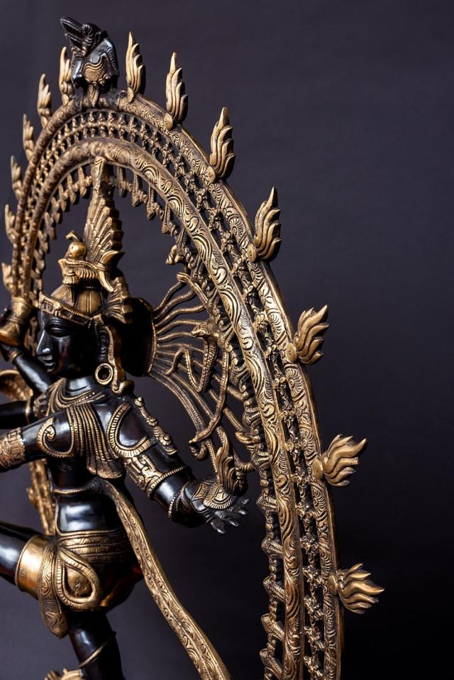ティラキタでは、これまでさまざまなシヴァの神像を扱ってきましたが、その中でもこちらは高さ120cmもある超特大!今までのシヴァ像の中でも、最大サイズ。神々しい存在感に打ちのめされる、極めて迫力のある像です。サイズも凄いのですが、細部の造形も見事な一級品です。一般的にブラス像は、金属のベースの色である金色のみ単色の場合が一般的です。一方こちらは、シヴァを中心に黒く塗装も施しており、金色と黒のコントラストが美しく高級感があります。職人による丁寧な仕事が感じられる品です。