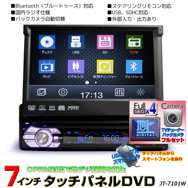 地デジCPRM対応 1DINインダッシュ7インチタッチパネル DVDプレーヤー +専用地デジ4x4フルセグチューナー +170度バックカメラセット スマホ連動 ラジオ USB SD 動画 音楽再生 外部入出力あり1din wowauto バックカメラ自動切り替え ブルートゥース内蔵