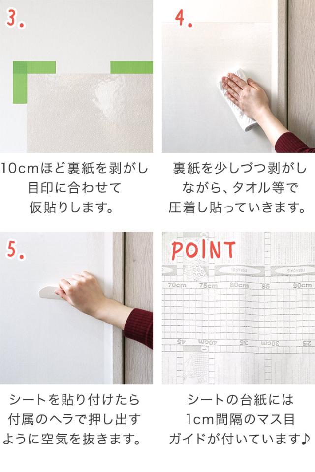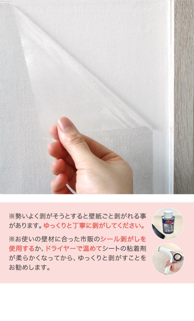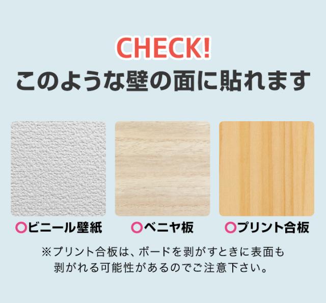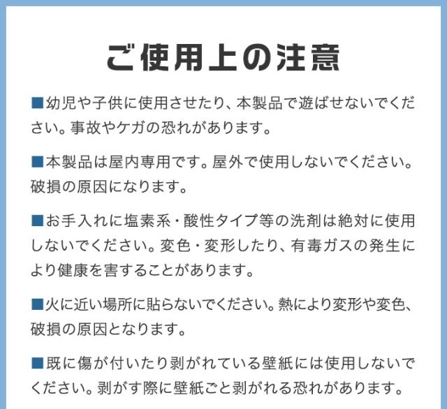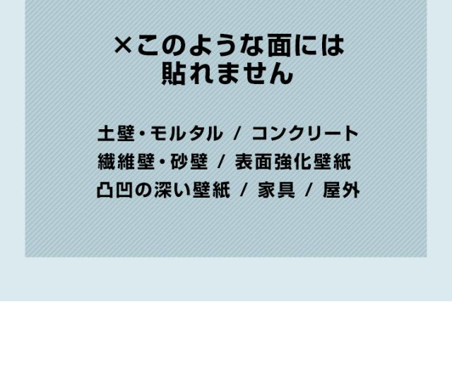 | 特記事項: 貼れる面:ビニール壁紙 / ベニヤ板 / プリント合板 貼れない面:土壁・モルタル / コンクリート / 繊維壁・砂壁 / 表面強化壁紙 / 凸凹の深い壁紙 / 家具 / 屋外 |
