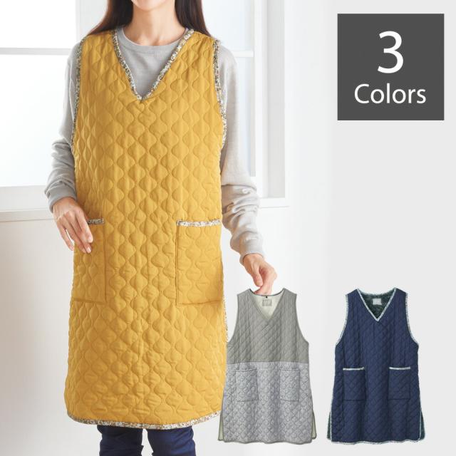 | 備考 | 袖なしで動きやすく、服の上からも着やすいゆったりとしたデザイン。 表地はキルト加工、裏地はボアでキッチンの冷え対策にオススメです。 ・両サイドにボタン付きでらくらく着脱 ・便利な大型ポケットにはスマホも入ります ・撥水加工でお手入れも簡単 |