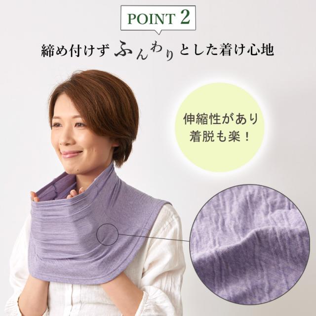 優しい肌触りで首元からデコルテ周りを包み、通常使いから外出にも、就寝時にも使えるアイテム。