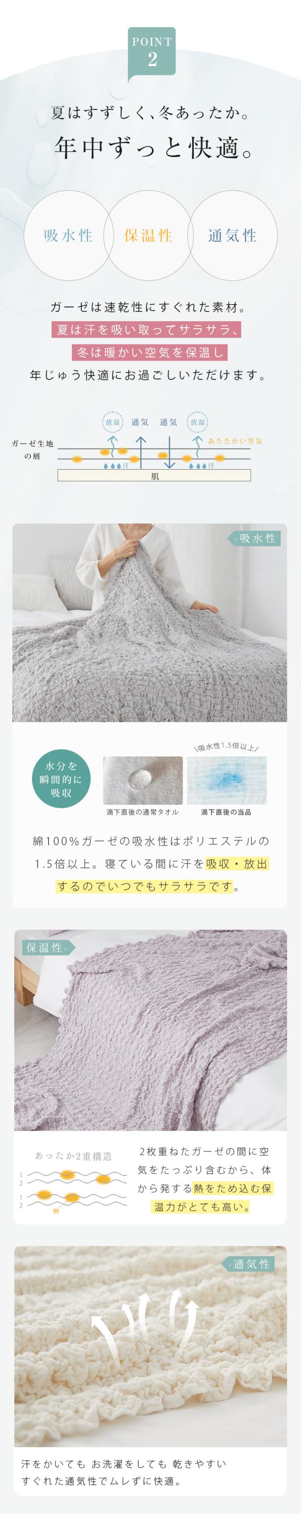 - 2枚目を洗い替えに購入しました。ガーゼケットなので軽くて肌触りが良く暑い夏を乗り越えて行けそうです。