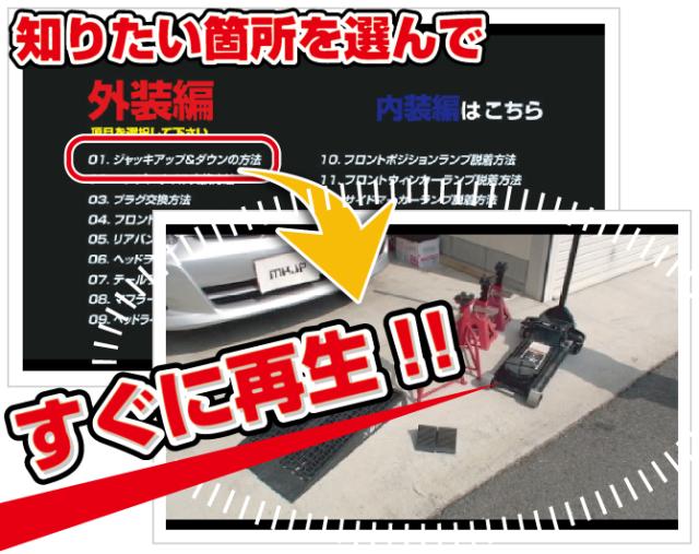この自動車メンテナンスDVDは、再生すると内装メニューと外装メニューを選択できるようになっていて、ドレスアップ&改造が直感的に作業できるように、見たいパーツ項目・パーツ交換手順ををすぐに再生することができます。難易度の高いチャプターは、取付け・取外しに必要な箇所や、注意点など詳しく解説しています。