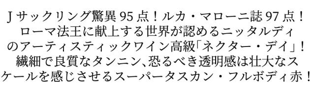 Jサックリング驚異95点!ルカ・マローニ誌97点!ローマ法王に献上する世界が認めるニッタルディのアーティスティックワイン高級「ネクター・デイ」!繊細で良質なタンニン、恐るべき透明感は壮大なスケールを感じさせるスーパータスカン・フルボディ赤!■さまざまなギフトアイテムをご用意しております。お中元 ギフト 御中元 お盆 お礼 敬老の日 クリスマス 冬ギフト お歳暮 御歳暮 お年賀 御年賀 お正月 年末年始 ご挨拶 バレンタイン ホワイトデー お返し 父の日 母の日 ギフト 贈答品 お土産 手土産 御祝 御礼 内祝い 引き出物 お祝い 結婚祝い 結婚内祝い 出産祝い 出産内祝い 引き菓子 快気祝い 快気内祝い 進学祝い 誕生日祝い バースデーケーキ プレゼント Wedding ウェディング ホームパーティ お花見 パーティ 退職ギフト 退職 就任祝い