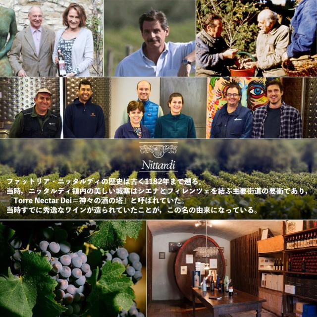 ![]() ファットリア・ニッタルディの歴史は古く1182年まで遡る。当時,ニッタルディ領内の美しい城塞はシエナとフィレンツェを結ぶ主要街道の要衝であり,「Torre Nectar Dei=神々の酒の塔」と呼ばれていた。当時すでに秀逸なワインが造られていたことが,この名の由来になっている。16世紀にはルネッサンス期の三大巨匠の一人ミケランジェロ・ブオナロティが所有し,造られるワインは当時のローマ法王(教皇)ユリウス2世とレオ10世(最初のメディチ家出身の教皇)に献上されていたほどで,ニッタルディの土地の力とそこから生まれるワインのクオリティの高さはつとに有名であった。1983年より現在のドイツ人当主,ペーター・フェムフェルト/Peter Femfertが所有している。キャンティ・クラッシコ地区の中心に位置する「カステリーナ・イン・キャンティ/Castellina in Chianti」(下図参照)の南向き斜面という最高の条件に恵まれた12ヘクタールの区画から,フィネスとパワーに満ちた優れたキャンティ・クラッシコが生み出される。 ![]() 【マレンマ地区】 キァンティ・クラッシコ地区の西,ティレニア海に面した西部海岸地域は,トスカーナでも特に注目されている。北にはサッシカイアで有名になったボルゲリ地区があり,その少し南のスヴェレート地区ではトゥア・リータがメルロー100%のワインで大成功を収めた。さらに南下すると,スカンザーノを中心とするマレンマ地区がある。この地区は標高が高く,比較的涼しい。また,土壌は他にないような酸性土壌で,ブドウの成熟に一役買っている。ファットリア・ニッタルディは,ロバート・モンダヴィやアンティノリもポテンシャルの高さに注目し,現地調査に乗り出したマレンマ地区に1999年に37ヘクタールのブドウ畑を購入,2005年秋に“ネクター・デイ 2003”をリリースした。 ![]() ラベルのアーティスト フィレンツェ出身のグラフィック・デザイナー兼写真家であるカテリーナ・デ・レンツィス・ソニーノ男爵夫人が担当した。彼女がこれまで手掛けたエチケットは,アルジャーノの「ソレンゴ」、テヌータ・サン・グイドのサッシカイアの弟分「グイダルベルト」、アンティノリの「ピアン・デル・ヴィーニュ・ブルネッロ・ディ・モンタルチーノ」など、超一流のワインのみ! |