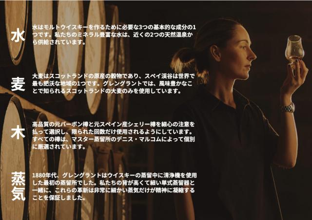 ![]() モルトウイスキーの中では最も華やかで、バランスに優れた銘酒が揃うスペイサイドにグレングラントの蒸留所はあります。 自然と職人技がつくり上げる、エレガントなシングルモルト1840年創業。スペイサイドを代表する ブランドです。 ![]() クリスプでクリアー、ライトな味わい。180年変わらないウイスキーづくりが、今も受け継がれています。 グレングラントはこれまで数々の国際的な賞を受賞してきており、その品質が高く評価されています。 ![]() 原料からボトリングまで一貫管理 グレングラントは、スペイサイドでは大麦栽培からボトリングまですべての工程をエステート内で行っている、唯一の蒸溜所。 ローゼスの自然 ローゼスの豊かな自然の恵みがエッセンスとなり、グレングラントの源となっている。 ![]() ユニークなポットスチル メジャーのあくなき探求心と情熱でつくりだされた、独特のフォームをしたポットスチルが、グレングラントならではのライトでデリケートな味わいが完成する。 クリスプでライトな味わい モルティング工程では麦芽の乾燥にピートを使わず、独特の軽やかさを実現。 |