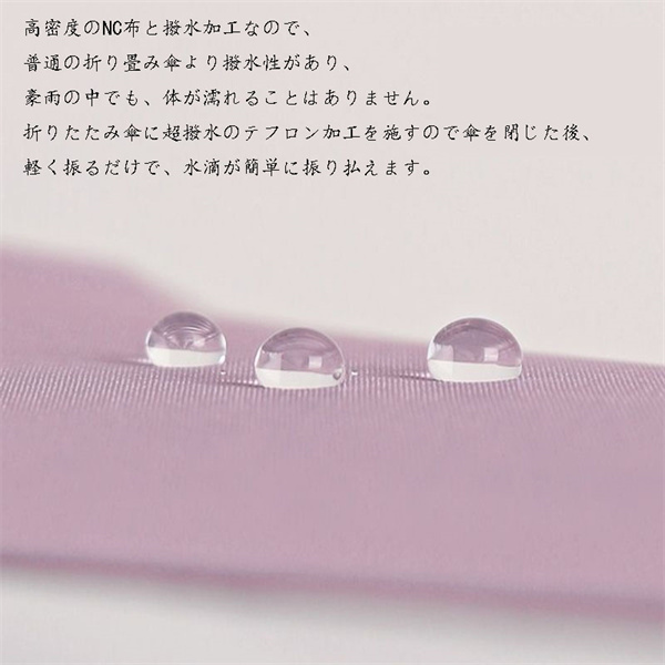 ★超撥水性:高密度のNC布と撥水加工なので、普通の折り畳み傘より撥水性があり、豪雨の中でも、体が濡れることはありません。折りたたみ傘に超撥水のテフロン加工を施すので傘を閉じた後、軽く振るだけで、水滴が簡単に振り払えます。