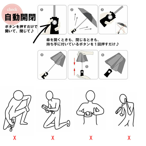 | 商品特徴 | 1、優れた耐風性:丈夫で壊れにくい8本骨!しっかりとした作りで風雨から守ってくれます。アルミニウム合金製中棒とガラス繊維&スチール製の傘骨を採用するので、錆びなくて、普通の傘より風に強い設計で、鉄製の傘より結構軽くて、豪雨、強風にも安心できます。 2、超撥水性:高密度のNC布と撥水加工なので、普通の折り畳み傘より撥水性があり、豪雨の中でも、体が濡れることはありません。折りたたみ傘に超撥水のテフロン加工を施すので傘を閉じた後、軽く振るだけで、水滴が簡単に振り払えます。 3、収納ポーチ付き:濡れた折り畳み傘の収納ポーチ付きます。訪問先や電車バスに乗る際のわずらわしさが解消されます。 4、持ち運びやすい:ワンタッチボタンで一秒で開閉できるので便利で安全です。ガラス繊維&スチール製により軽くて持ちやすく、一般的な傘と同じ八本骨で耐久性も十分です。 5、自動開閉折りたたみ傘。耐久性のある高密度で防水性の高い布地を利用しているため、撥水性に非常に優れております。 |