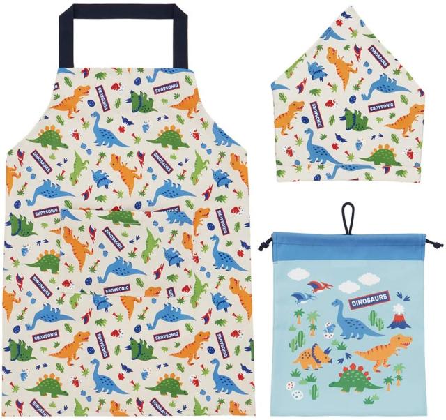 かわいい恐竜柄のエプロン・三角巾・巾着の3点セット