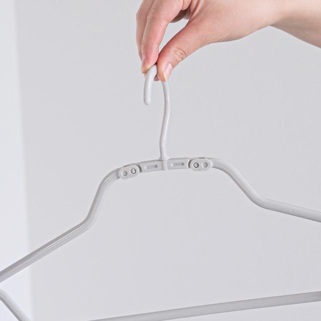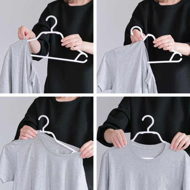フック根本のサイド部分が折れて変形するので、衣類の襟元を伸ばさずに首側からハンガーを入れることができます。襟元を気にせず、衣類を簡単に掛けられるため、面倒だったハンガーへ掛ける作業時間が大幅に短縮します。