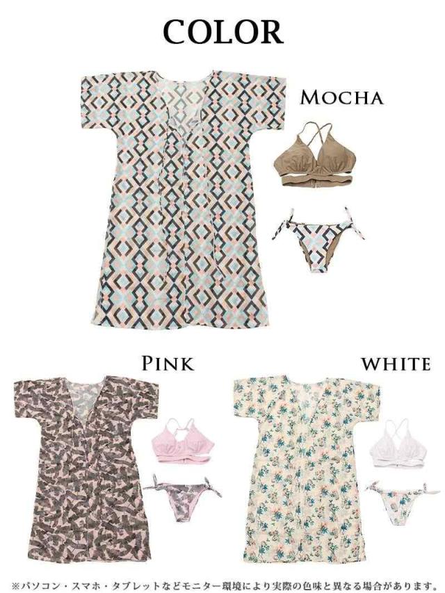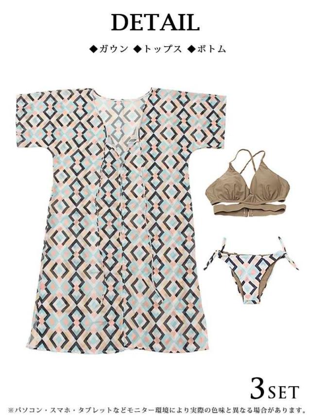 ☆シアーなシフォンロングガウン付きなのでホテルからビーチまで直接行けちゃうリゾート感たっぷりのレディース水着3点セット♪