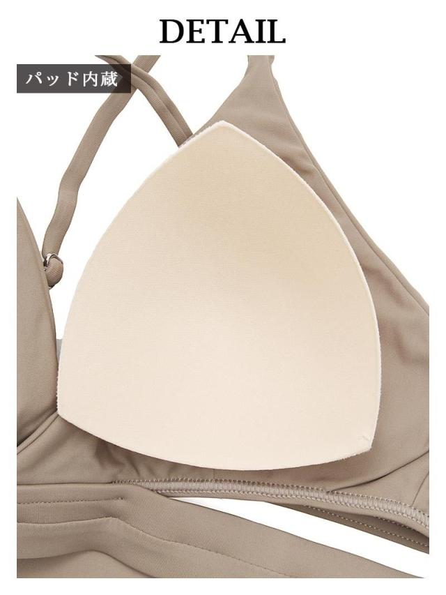 ☆ダブルアンダーとバッククロスが特徴的なホールド感ある三角ビキニと脚長効果のあるハイレグにサイドのリボンがアクセントになったショーツがセットになったセット水着♪