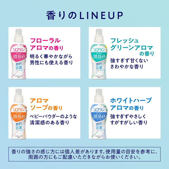 商品名 ソフラン 柔軟剤 プレミアム消臭 詰め替え特大 950mL×6個 ケース販売 ブランド ソフラン メーカー ライオン 香り フローラルアロマの香り、アロマソープの香り、ホワイトハーブアロマの香り、フレッシュグリーンアロマの香り 容量 950mL×6個 成分 界面活性剤(エステル型ジアルキルアンモニウム塩)、安定化剤、香料 生産国 日本 使用方法 【使用量の目安】