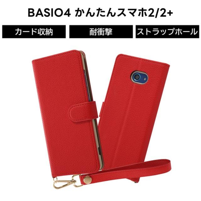 BASIO4 かんたんスマホ2 ケース 手帳型ケース クリアポケット ハンドストラップ ルーペ付 レッド KYV47 保護 シンプル かわいい おしゃれ 可愛い オシャレ 透明 カード収納