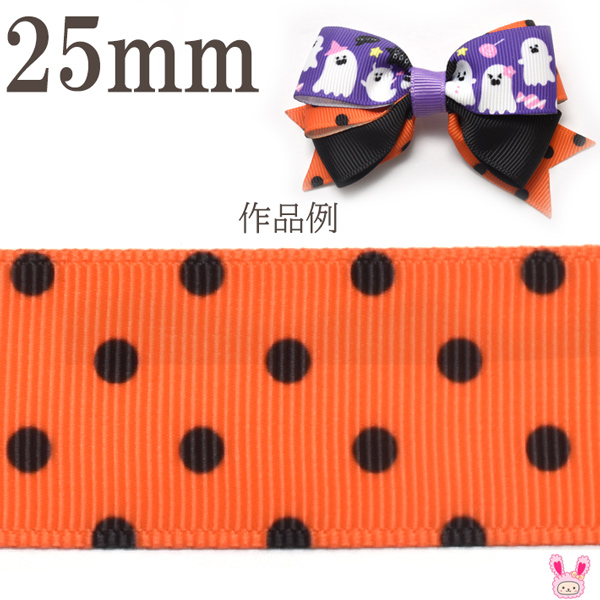 25mm プリントリボン ハロウィン 黒い水玉のオレンジリボン 2m