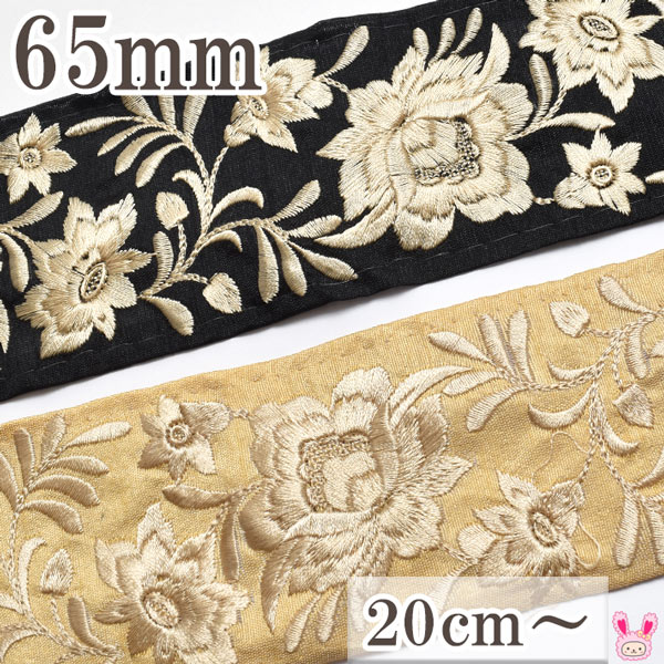 インド刺繍リボン 65mm ゴールド刺繍のエレガントフラワー 10cm単位 切り売り(20cm以上) [在庫限り]