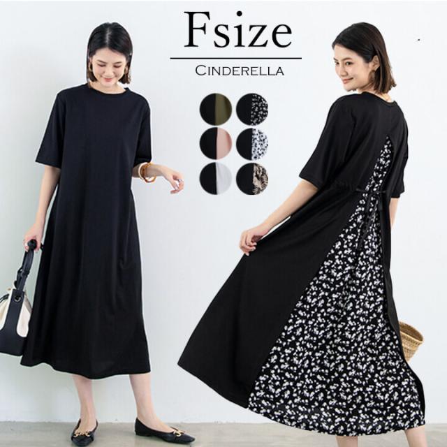 レイヤードワンピース 異素材 シンプル クルーネック 切替 バックスリット 20代 30代 40代 ミディアム 膝丈 エレガント 大人 レディース ブラック 黒 花柄 フラワー 葉柄 リーフ ネイビー 緑 グリーン ピンク ホワイト 白 袖あり 半袖 sprt2138 F フリーサイズ