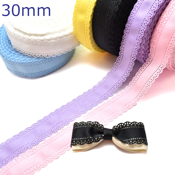 柔らかな質感のグログランリボンを、レースのようにパンチング加工したリボンです。両サイドはスカラップの形にカットされ、可憐で愛らしい印象。透け感のある細かなドット状の穴があしらわれ、本物のレースのような軽やかさを表現しています。シンプルながらもゆめかわいい雰囲気があり、メルヘンやプリンセスをテーマにした作品づくりにぴったり。アクセサリーやラッピングの装飾に重ね使いしてもおしゃれで、組み合わせの幅が広がるリボンです。