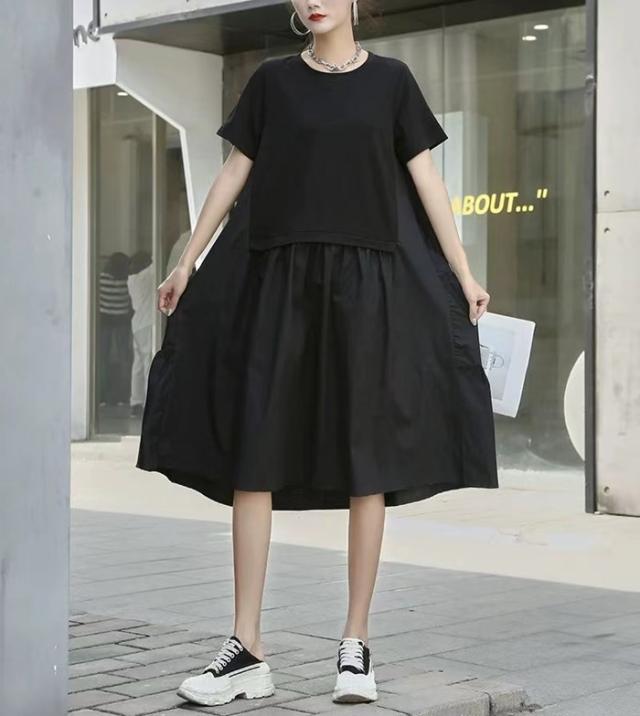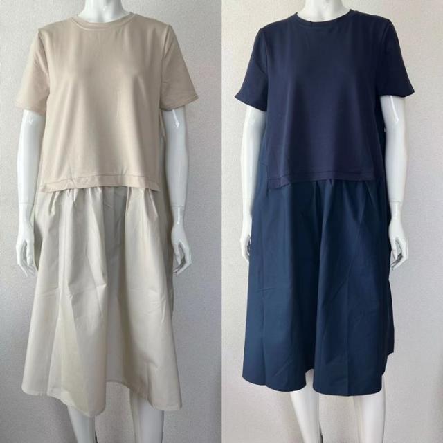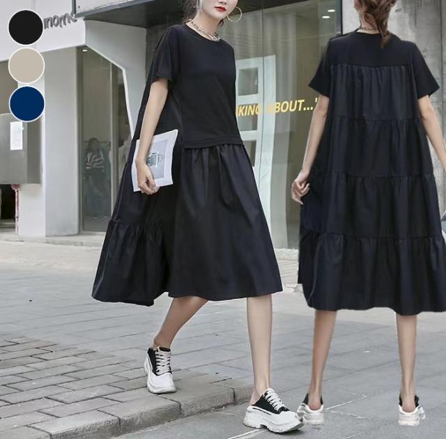 ワンピース ロングワンピース マキシ Tシャツワンピース 半袖 ゆったり ロールアップ バックギャザー 異素材Aライン Tシャツワンピース