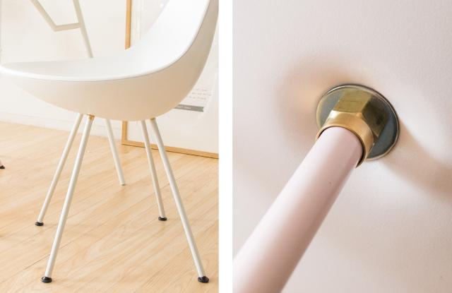 ハの字に広がったシンプルな細い4本の脚部は、座面と同じカラーで塗装されており統一感があります。強度の高いスチールに、水や傷に強いエポキシ樹脂の紛体塗装を施した脚部は、細くても座面をしっかり支えます。