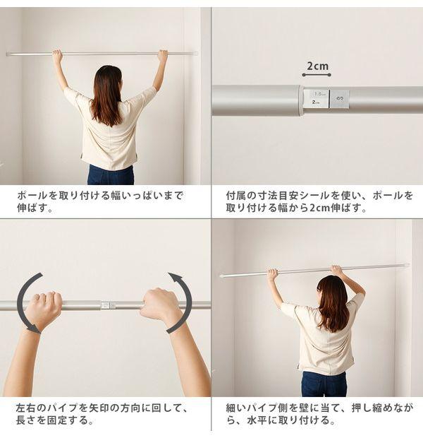アルミを使用することで、濡れたものを直接かけてもさびにくく、長くお使いいただける突っ張り棒です。素材の軽さに加えて、取り付けもカンタン。また、キャップを外せる構造なので、カーテンリングを通すこともでき、さまざまな使い方が可能です。