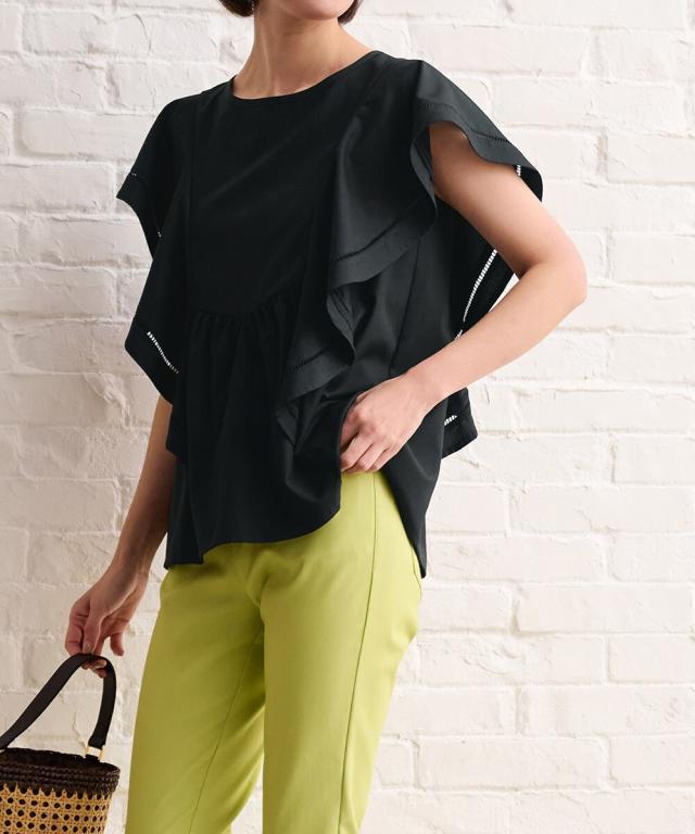存在感のある肩口の大きなフリルがこだわりのブラウス。ウエスト部分のギャザーと大きめフリルでお腹まわりと二の腕をおしゃれにカバー。フリルに施したはしごレースがおしゃれ。