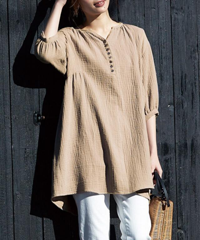 綿100%でポコポコとした凹凸感が特徴のやわらかなダブルガーゼ素材。多ボタン使いが今っぽいシャツチュニック。さらっとした肌ざわりとゆったりとしたシルエットで夏でも快適。
