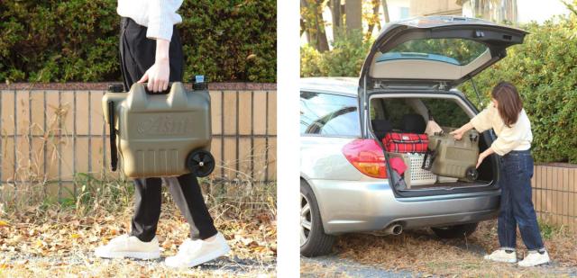 水を入れた状態でも持ち運びしやすく、大き過ぎないサイズ感です。車のトランクに収まりやすいサイズです。