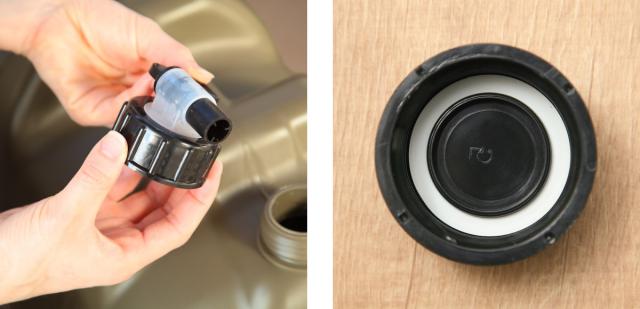 | コック部分 コックの部分は分解ができません。このまま外してご使用ください。 | パッキン 蓋にはパッキンが付いているので、持ち運びの時に水漏れがなく安心です。 |