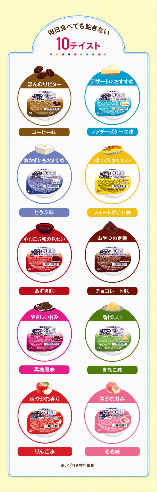 デキストリン、しょ糖、大豆油、大豆たんぱく、中鎖脂肪酸油、紅花色素/乳化剤、ゲル化剤(寒天、増粘多糖類)、クエン酸、グルコン酸Na、香料、甘味料(スクラロース、ステビア)