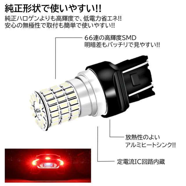 66連 全体発光 爆光LED T20 ダブル 無極性 ブレーキランプ ストップランプ テールランプ 赤 レッド 2個