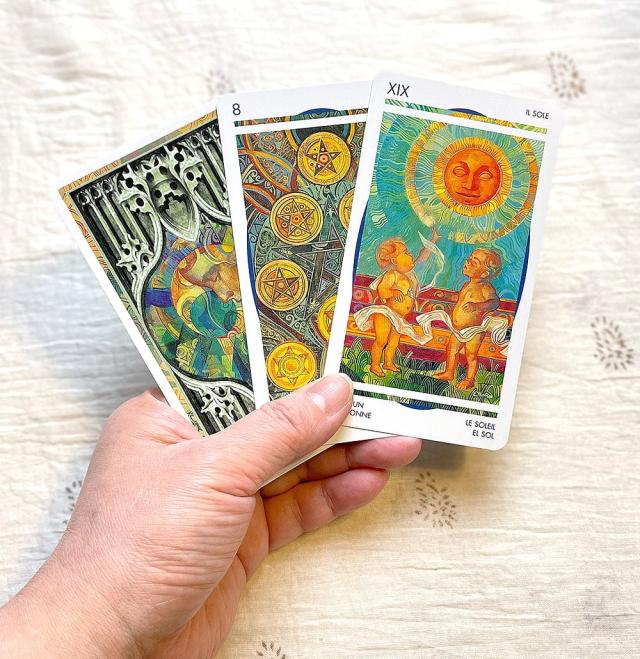 タロットカードは、大アルカナ22枚、小アルカナ56枚、合計78枚のカードで、デイリー占いやマンスリー占いなどの1枚引きでの簡単な占術から、多種多様な方法とスプレットを用いて問題の焦点を絞った詳細な質問等の答えを導き出すこともできるカードです。占術方法には、スプレットや引きのルールなど古来からのものがありますが、その反面、オラクルカード等の他種類のカードとの混合占術、タロットカードを2セット使用等の占術の方法など自由度も高く感性とインスピレーションでの引きの答え、占う内容をあまり選ばない汎用性と多様性を併せもつカードです。