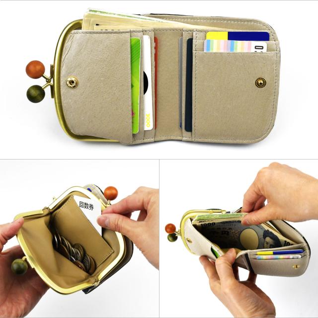 口金のボール部分に丸木玉を使用した、新感覚がま口です。通常の口金よりも持ち手が大きいため、開閉しやすくなっており、手には木の温もりを感じることができます。口金中央の丸い金属パーツがストッパーになっているので、がま口ならではのパチンという音も健在です。異素材の組み合わせではありますが、レトロな口金とナチュラルな木の質感は相性抜群。がま口のコロンとした可愛らしさが強調されています。